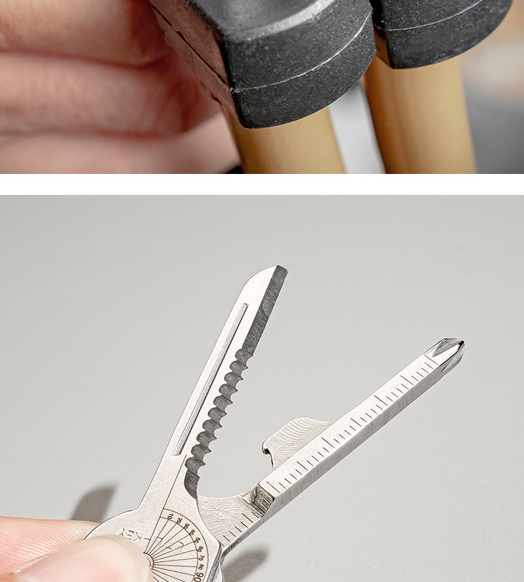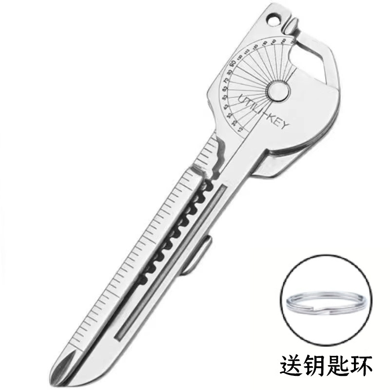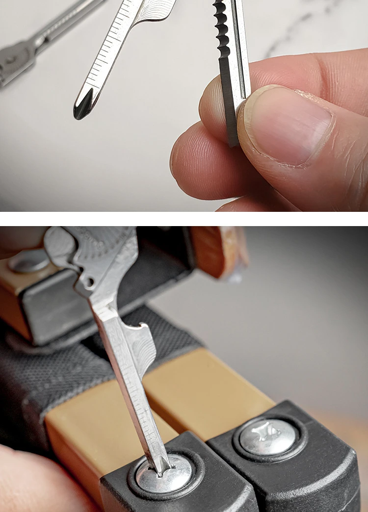 eight functions in one compact design, including a slotted screwdriver, keychain hanging hole, angle ruler, rope cutter, scale, bottle opener, screwdriver, and pocket knife.